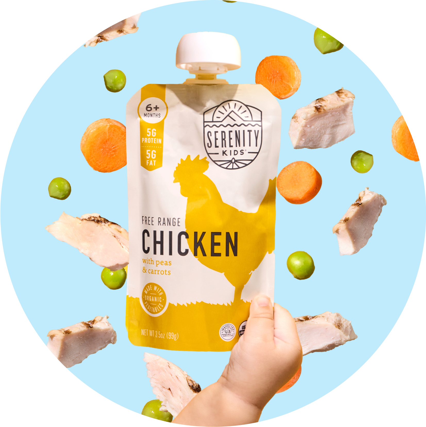 Serenity Kids free range chicken with peas and carrots food pouch on a white background