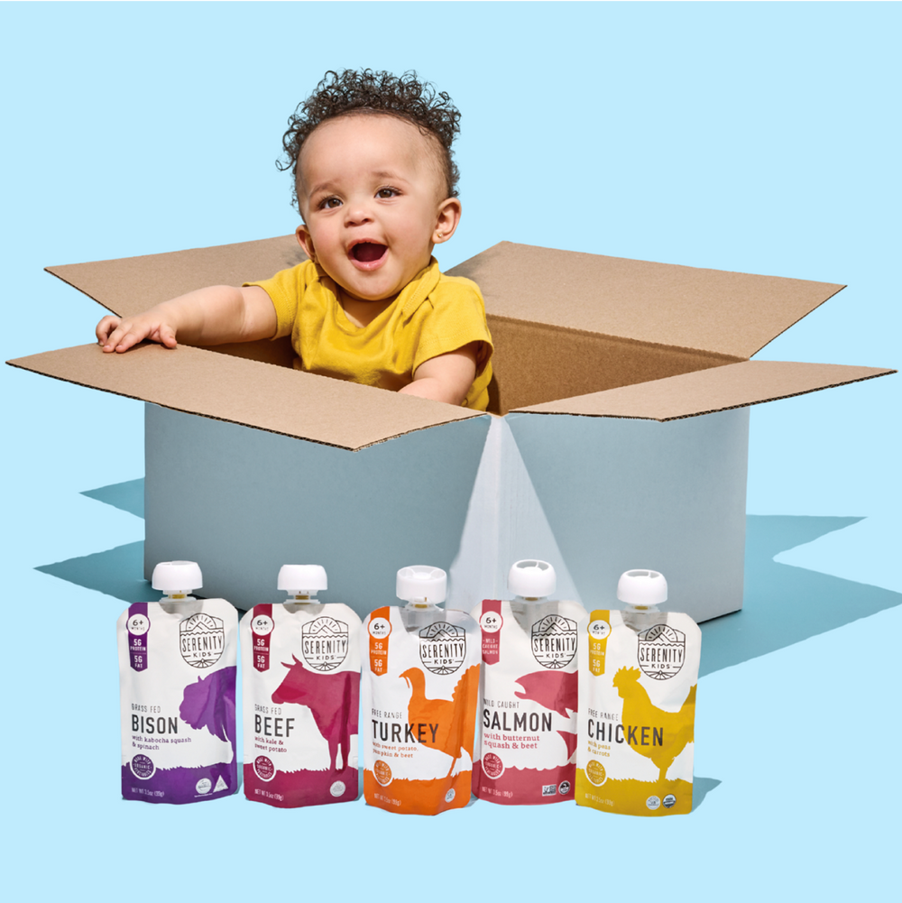 Four Serenity Kids food pouches illustrations on a white background